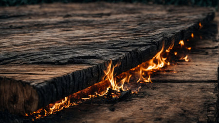 Vivid orange blaze consumes aged timber, highlighting the stark contrast between lively fire and the rugged, blackened surface in a striking outdoor display.