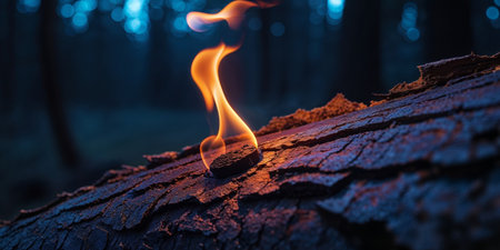 AI Generated. Natural torch ignition in the wilderness closeup of a lit flame on tree bark at night