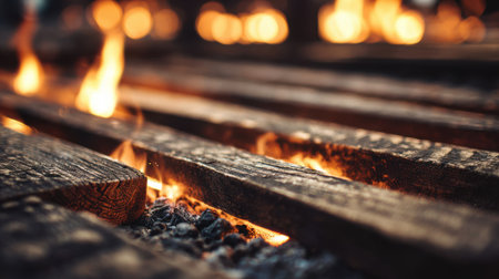 This striking image captures the mesmerizing dance of flames over a charred surface, showcasing the interplay of light and dark in a captivating visual experience.