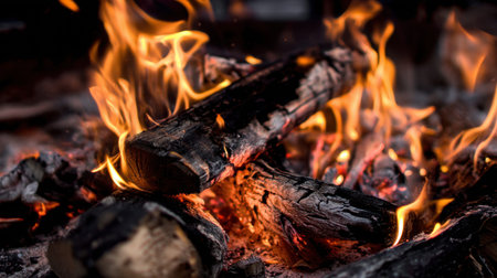 Captivating image of flames dancing around blackened logs in a fire pit, creating a warm and inviting atmosphere perfect for cozy gatherings.