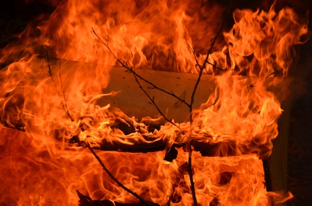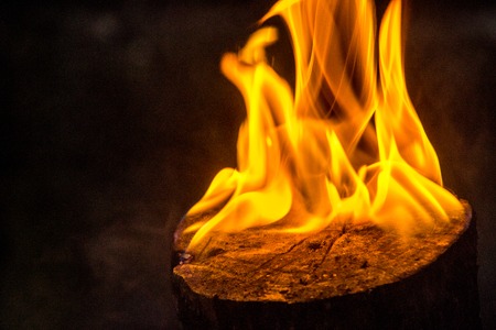 Bright flame of a burning fire in the dark.