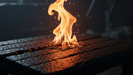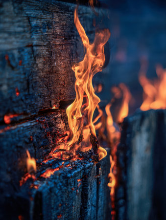 A close-up view of intense orange flames leaping from a dark, heavily charred wooden surface. Small embers and sparks are visible, adding to the dynamic and dangerous feel of the scene. The wood is deeply textured with burn marks, and the background is dark and out of focus, emphasizing the fiery The lighting highlights the vibrant colors of the flames against the dark wood.