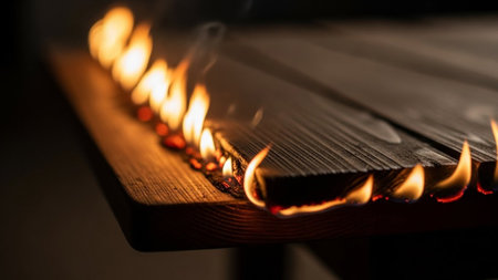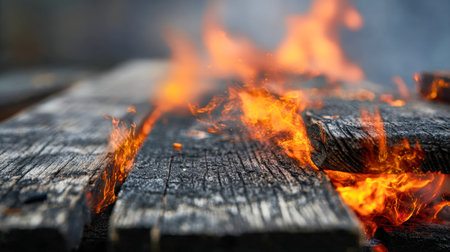 A dramatic close-up shot focusing on the edge of dark wooden planks engulfed in bright orange flames. Wisps of smoke rise from the burning edges, highlighting the intense heat and destructive nature of the fire. The wood grain is visible beneath the flames, contrasting with the fiery glow. The background is dark and out of focus, all attention to the burning and the dynamic play of light and shadow from the fire.