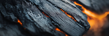 Close up view of smoldering wood embers radiating intense heat, revealing a captivating display of glowing orange cracks and intricate crevices amidst the dark, moody background