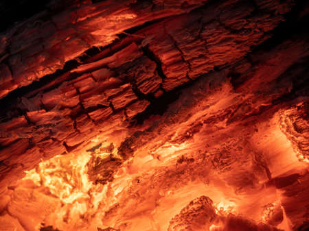 Burning log of wood close-up as abstract background. The hot embers of burning wood log fire. Firewood burning on grill. Texture fire bonfire embers. Smoldering fire