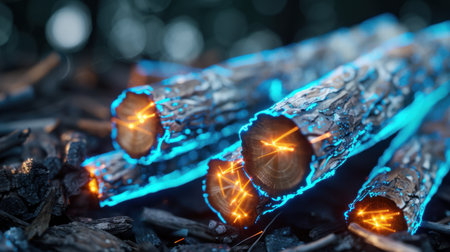 A stunning close-up image of glowing logs illuminated by sparks and soft blue light against a dark natural backdrop, evoking warmth and tranquility.