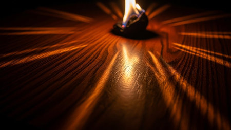 A close-up shot focuses on a dark, polished wooden surface with prominent grain patterns. A small, fiery burns at the of the frame, casting intense orange and yellow light rays that spread outwards across the wood. The light creates a dramatic, abstract pattern of shadows and illumination, highlighting the texture and sheen of the polished surface. The overall mood is warm, intense, and atmospheric.