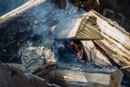 Burning firewood. The logs are on fire. Bonfire. Fire and blue smoke. Bonfire for cooking.