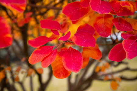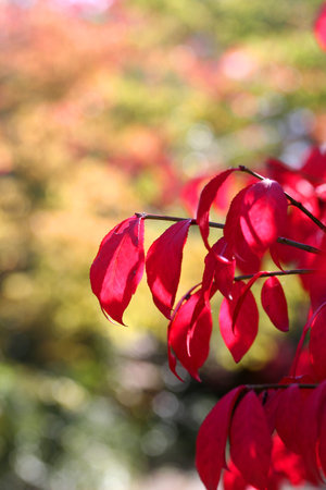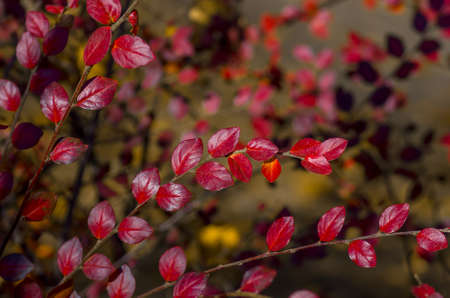 Bright red foliage of an ornamental euonymus shrub in autumn. Selective focus on one branch with leaves.