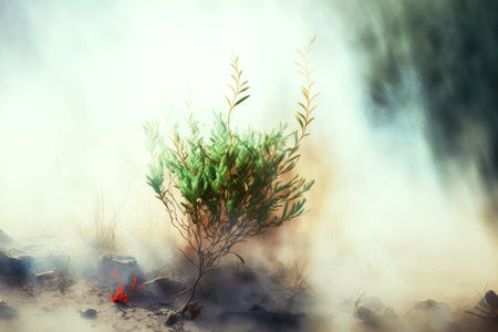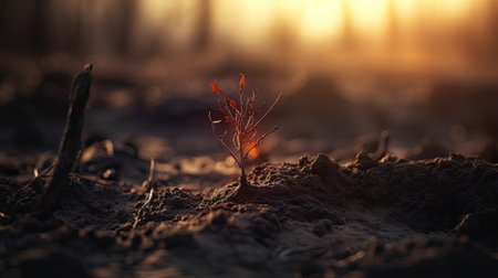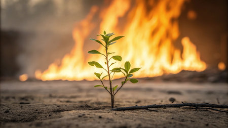 A vibrant green sapling stands resiliently among charred trees and ash, representing hope and renewal in a post-wildfire landscape. Natures ability to recover is beautifully captured.