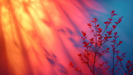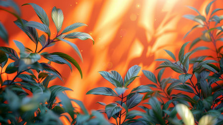 Lush green plants offset by a bright orange background with soft shadows and warm, radiant sunlight creating a peaceful, serene environment.