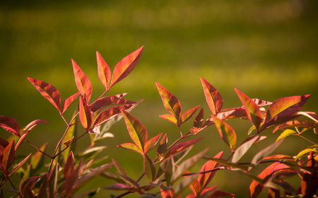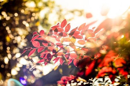 The red, fall colors of a border shrub around a garden in Yamato, Japan, backlit by the bright afternoon sun