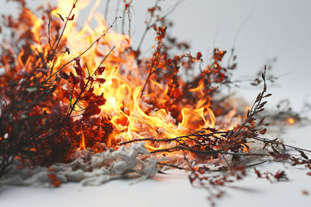 Intense flames consuming shrubs and trees with swirling smoke and ash