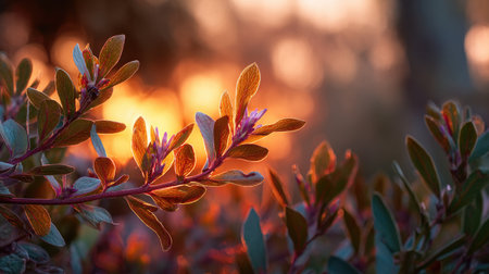 The Sorrel at sunset, Golden red sunset light filters through the leaves, still atmosphere, warm orange glow blending with natural green