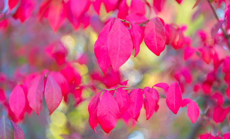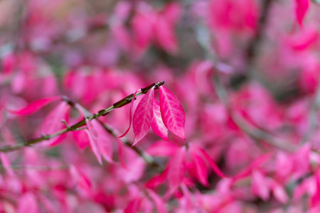 Autumn pink bush in forest , colorful background of stunning Euonymus alatus, winged spindle, or burning bush popular ornamental shrub plant tree with attractive fall hot pink purple leaves in autumn