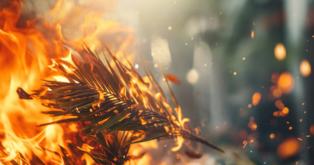 Burning dry grass and twigs with glowing ashes drifting in smoky forest atmosphere at dusk with warm light