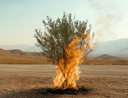 A striking image of a solitary tree engulfed in flames, surrounded by ominous dark smoke, capturing the intense beauty of nature's fury and resilience.