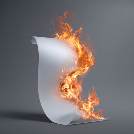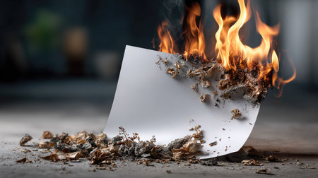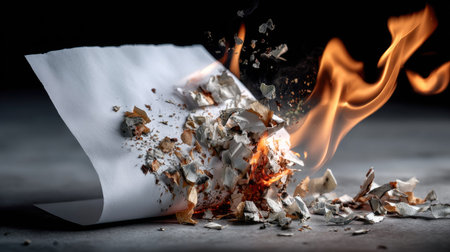 A captivating scene depicting a sheet of paper igniting in flames, surrounded by scattered debris, illustrating the power of fire and transformation.
