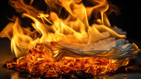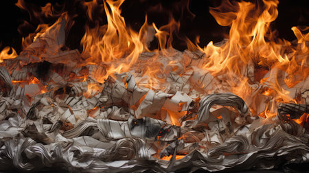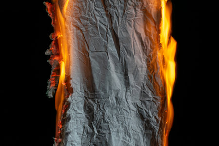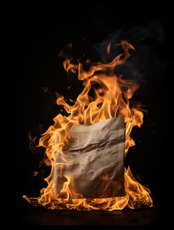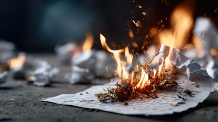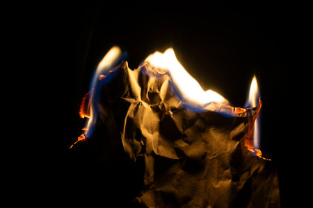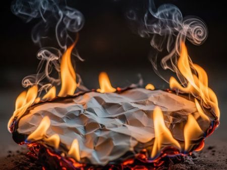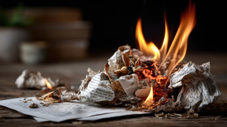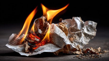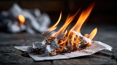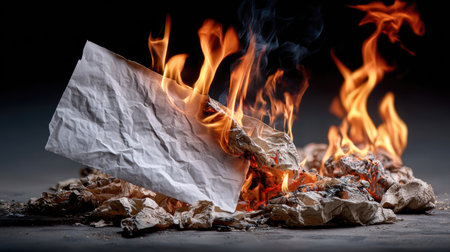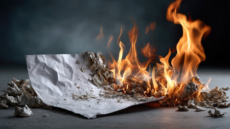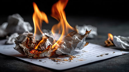 This striking image portrays crumpled paper engulfed in flames, creating a dramatic visual contrast against a dark background. The burning paper symbolizes destruction and transformation.