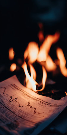 Burning financial document with a declining stock graph illustrating concepts of market collapse, economic crisis, recession, debt, bankruptcy, and business failure