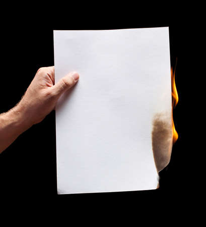 Burning sheet of paper on a white background with space for text.