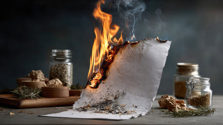 This striking image showcases a piece of burning paper with flames and smoke, set against a dark kitchen atmosphere. Surrounding herbs and spices enhance the culinary mood.