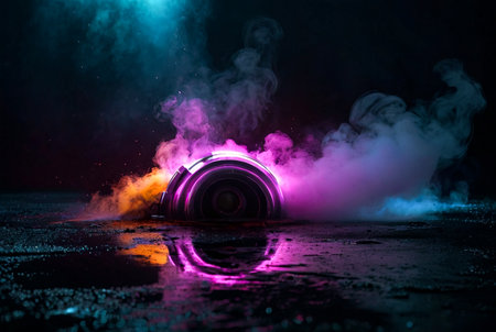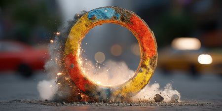 A vibrant colorful ring emerges from a dusty street, surrounded by sparks and illuminated urban lights. This captivating image captures energy and movement.