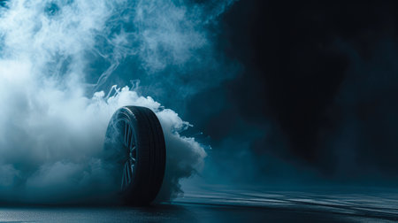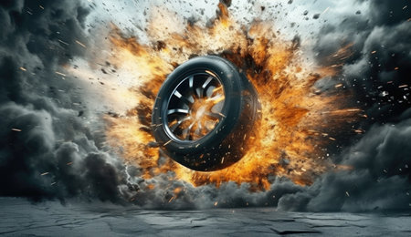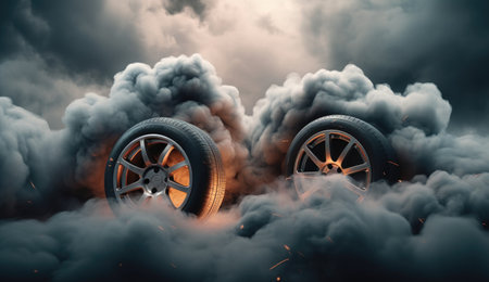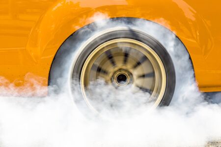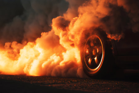 Close up view of a car wheel burning rubber on asphalt, generating a thick cloud of fiery smoke and showcasing raw power and speed