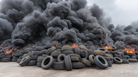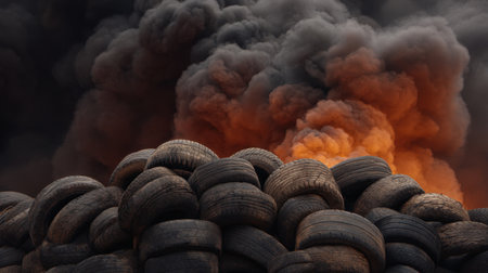 An unsettling image of a towering pile of used tires contrasted with dark smoke and flames, highlighting urgent environmental concerns and pollution issues.