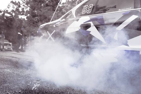 Modern racing car with blue smoke from under wheels on black background, closeup