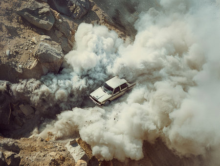 A striking overhead shot captures a yellow vehicle traversing a road enveloped by dark, swirling clouds. The composition features contrasting colors and textures, creating a dramatic visual effect. The scene evokes a sense of movement and immersion, suitable for various commercial applications or editorial uses.