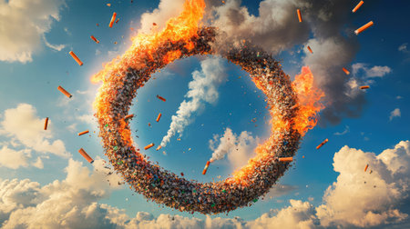 A surreal depiction of a burning circular structure made from waste materials, surrounded by vibrant clouds against a clear blue sky, symbolizing environmental issues.