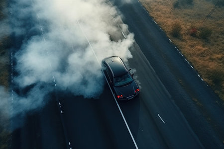 Dramatic road scene with thick smoke cloud rising from asphalt surface in dark atmospheric setting
