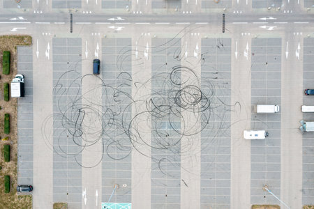 An overhead shot depicts a red car engaged in drifting, generating a cloud of smoke. The vehicle is positioned on a circular track, with visible tire marks and concrete barriers. The scene is illuminated with natural light, showcasing a dynamic composition suitable for commercial or editorial applications.
