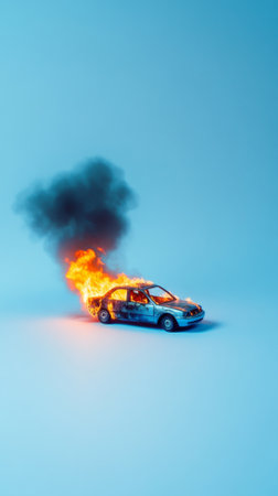 Smashed car in the center of a highway, emergency flares creating a perimeter around the scene