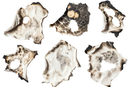 irregularly shaped burnt holes in paper, showing detailed textures, isolated on a white background. Generative AI