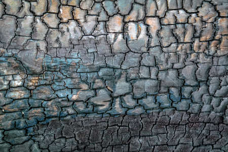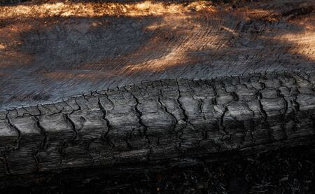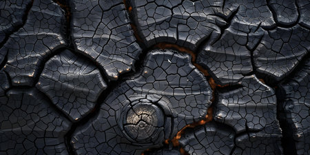 Close-Up Texture, Cracked and Weathered Wood, Charred Black and Orange Surface, Abstract Background