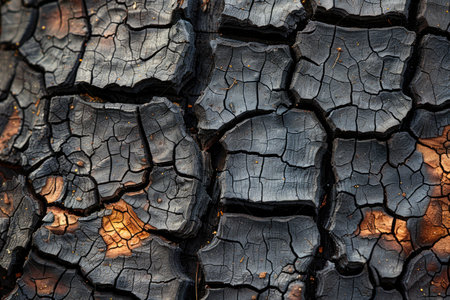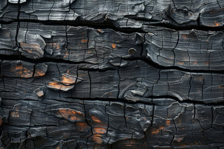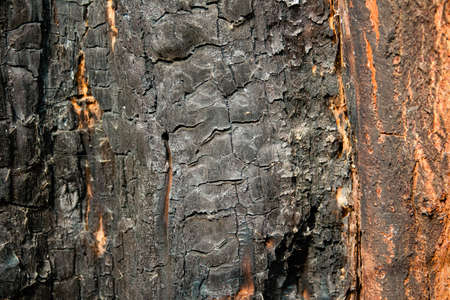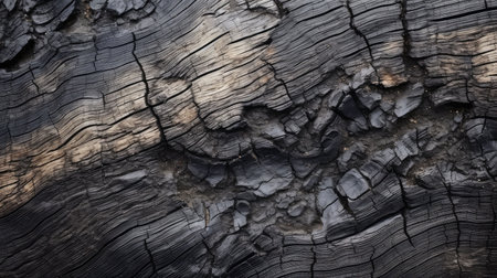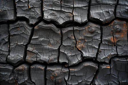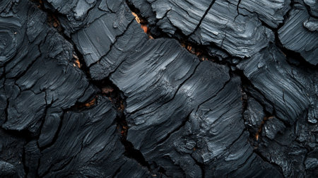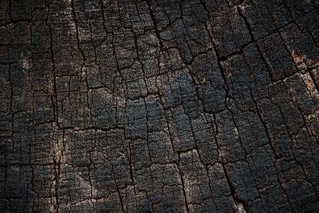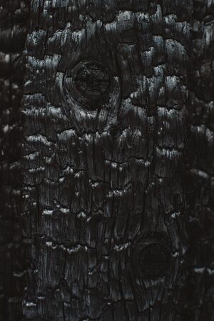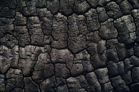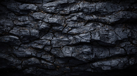 Black cracked tree bark texture close up. Abstract nature background. Burnt wood grain pattern. Grunge texture for design and decoration. Dark charcoal wooden surface. High quality nature photography.