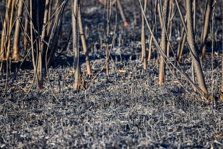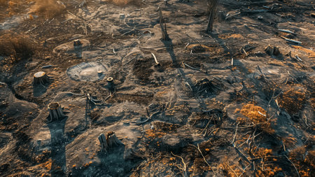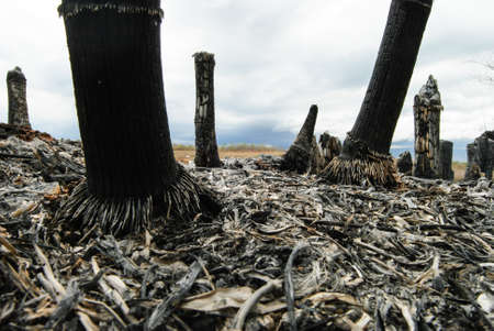Burned tree stumps and ash-covered ground in a forest fire aftermath, illustrating the long-term ecological impact of wildfires