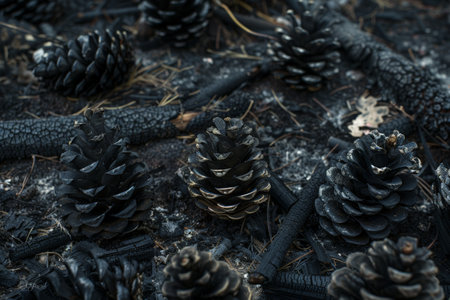 A close-up of charred pinecones on the forest floor, remnants of the fires destructive power.