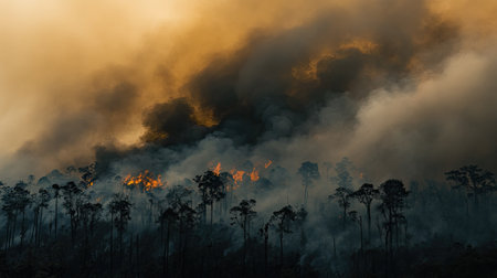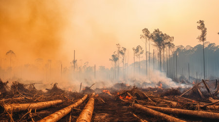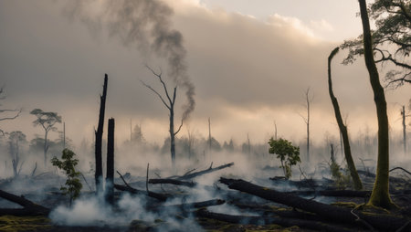AI Generated. Deforestation aftermath in a cloudy forest during early morning with smoke rising