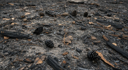 A poignant and detailed close-up shot of the forest floor in the aftermath of a wildfire. Charred pieces of wood, burnt pinecones, and ash-covered ground reveal the devastating impact of the fire. This powerful image is suitable for topics concerning forest fires, the effects of climate change, environmental disasters, and the loss of nature.