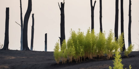AI Generated. Scorched hillside with charred tree trunks and new growth emerging