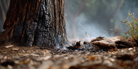 A close-up of charred tree trunks and ashes after a wildfire, with a soft focus on the burnt landscape, symbolizing destruction and the aftermath of fire.