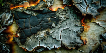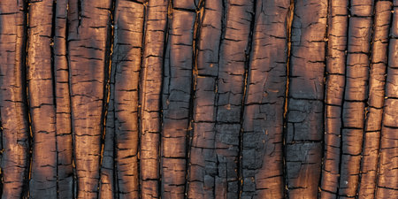 A detailed depiction of charred wood showing intricate cracks and deep colors. The wood's surface features textures revealing a history of fire damage under bright sunlight.