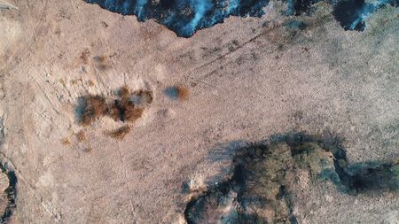 Dry grass burns, natural disaster. Aerial view. The line of fire slowly moves through the dry field.