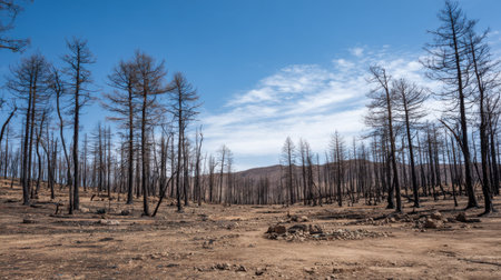 Desolate Landscape After Forest Fire Featuring Charred Trees, Scorched Earth, and Clear Blue Skies in a Remote Area of Nature Recovery