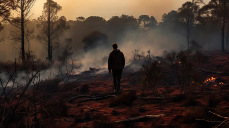 This image captures a barren landscape with dead trees silhouetted against a smoky horizon, highlighting the drastic effects of climate change on nature and the environment.