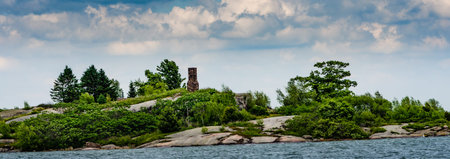Panorama of an isolated chimney on a windswept island in the St. Lawrence River