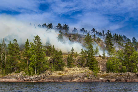 Smoke rises from the forest. The forest is burning on the island. Fire in the wild. The trees are burning on the island. Smoke over the forest. Forest fires.